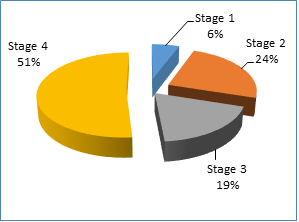 Regarding sex between the two groups, there was a non-significant difference between them (P - 0.85), 60 patients with lung cancer (31 males and 29 females), and 60 healthy persons as controls (32 males and 28 females). The frequency was the highest in the fourth stage 31 (51%) and lowest in the first stage 4 (6%). As shown in Figure 1.