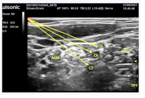 To facilitate effective medical rehabilitation, the Continuous Interscalene Block (CISB) technique with Patient Controlled Analgesia (PCA) was performed under ultrasound guidance. After the patient was positioned, anatomical landmarks, including the sternocleidomastoid, anterior scalene, and middle scalene muscles were identified. The brachial plexus roots appeared as a “cluster of grapes” on ultrasound (Figure I).
